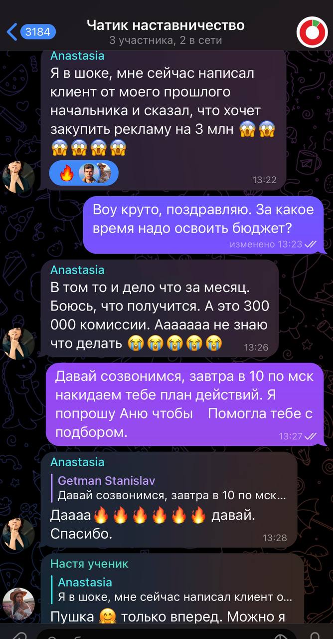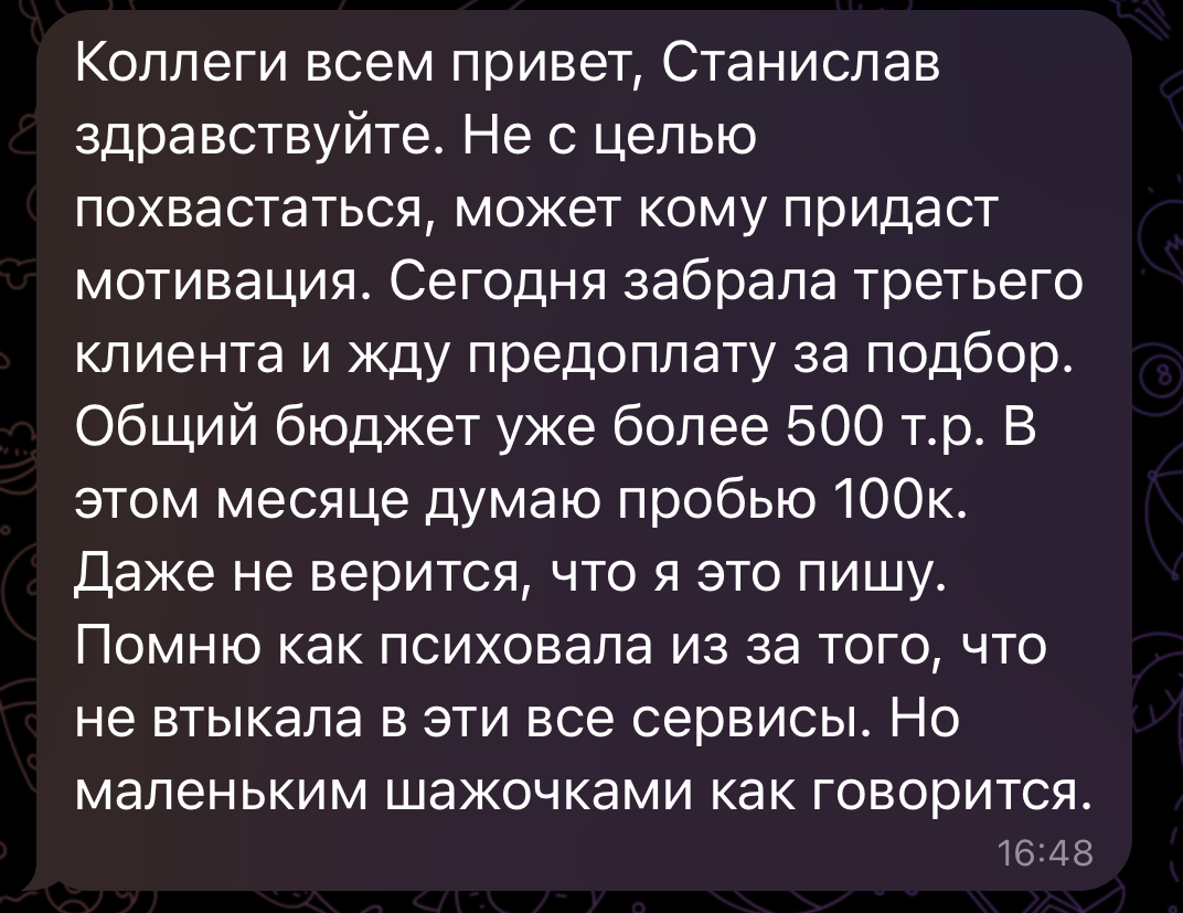 Первые деньги заработала уже в первый месяц - 30 000 рублей на создании рекламных подач и подборе каналов из базы. Далее взяла 3х клиентов из нашего чата на общий рекламный бюджет 750 000 т.р.
